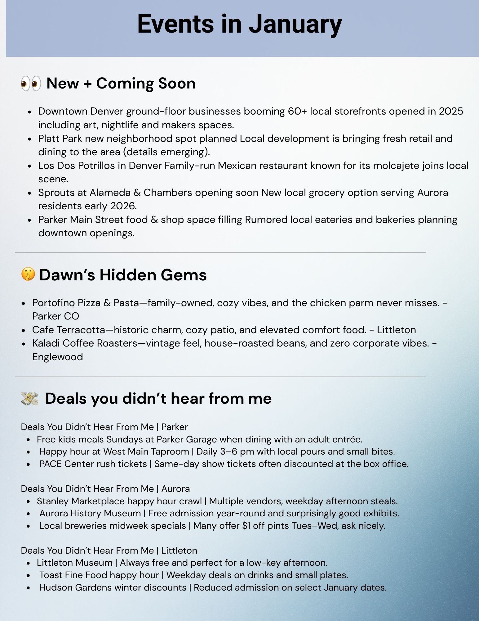 Here’s your local insider guide with events, coffee spots, and deals around Parker, Aurora, and Littleton.